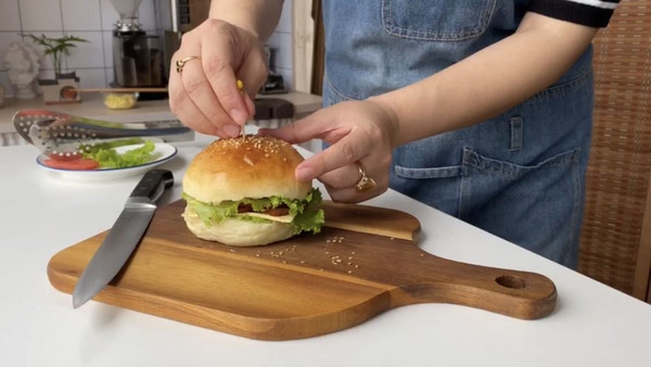 把另一片汉堡胚盖在最上面,可以找一个花签子扎在汉堡上,这样一是好看,另外如果做巨无霸汉堡,有签子扎上多少层也不会倒。