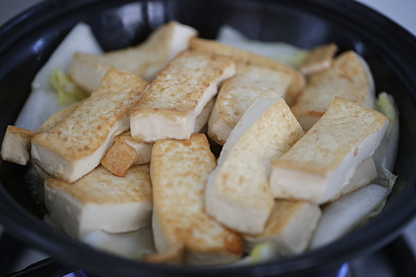 放分量外的油起油锅,把豆腐煎到两面金黄,留在锅里备用;