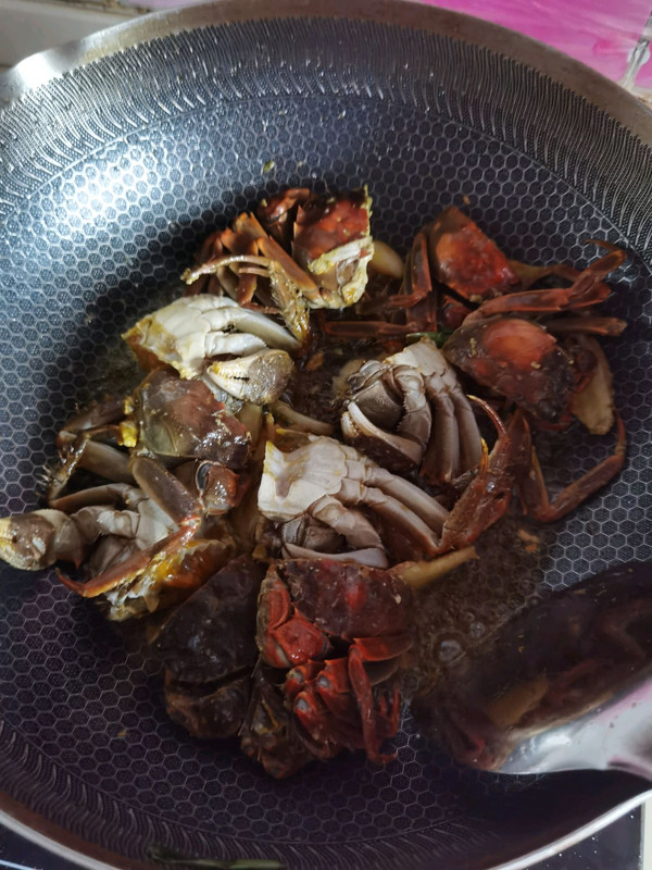 倒入螃蟹,炒的壳变黄。