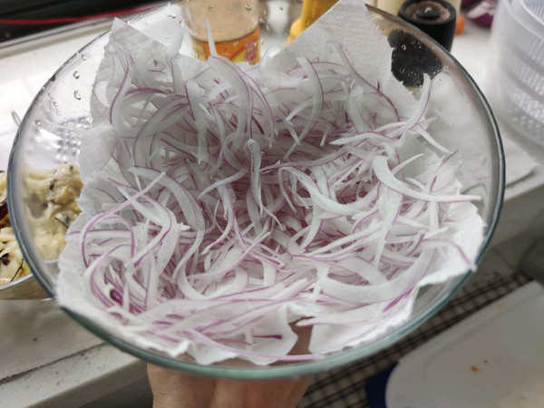 洋葱泡水10分钟去除辣味 捞出甩干 用厨房用纸吸干水分