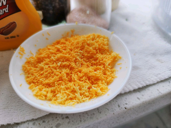 鸡蛋煮熟 蛋白切碎 蛋黄取一个黄黄的用筛网压成末 剩下的蛋黄压碎