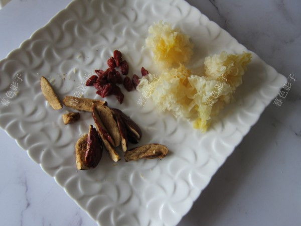 白木耳掰成小块,红枣切成小条,枸杞几颗。