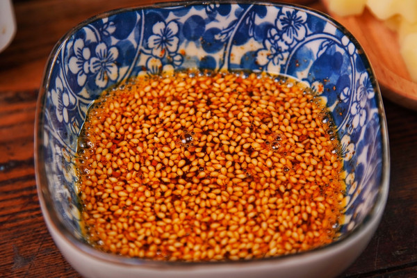 用锅里的油把孜然,花椒粉,辣椒面,十三香,白芝麻泼香