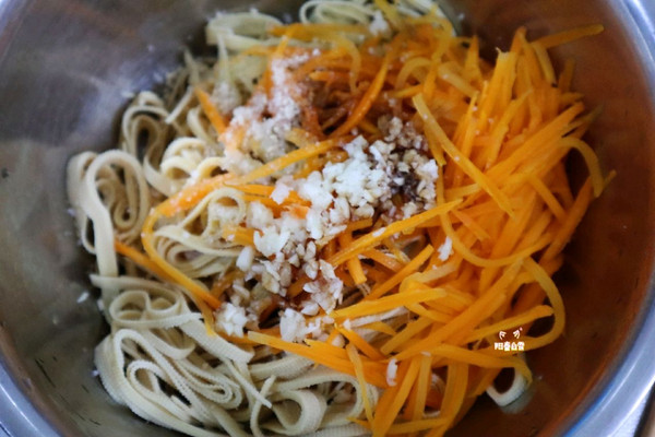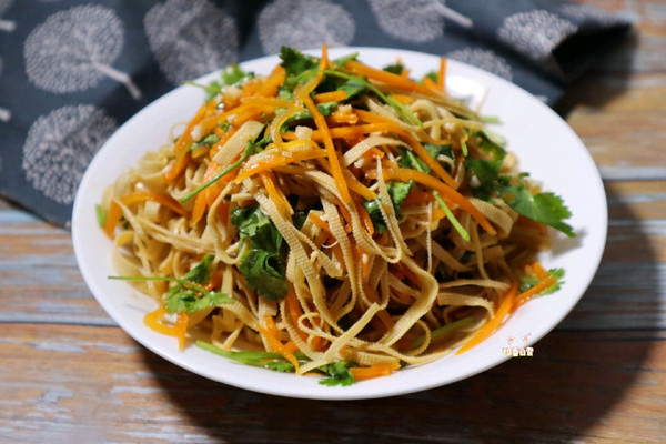把焯水的豆腐皮切丝,胡萝卜丝放进去,加入蒜末,盐,味极鲜,鸡精
