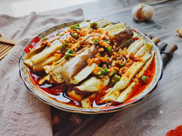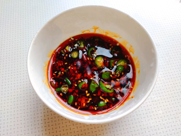 这个是时候锅蒸茄子,可用炖锅加水蒸10分钟,这个时候准备调料,蒸鱼豉油、醋、白糖、蒜末、青辣椒搅拌均匀,红辣椒油用热的,倒入碗中,没有热的可用锅热一会儿。热油可把辣椒和蒜的味道逼出来。
