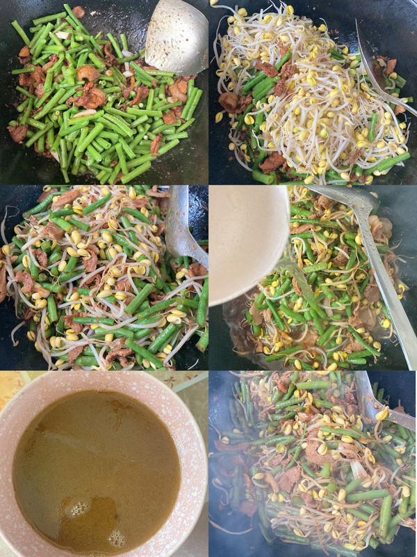 依次放入焯好的豆角、黄豆芽,翻炒片刻。倒入半碗左右清水,翻炒后,盖上盖子,等水烧开,把油水撇到碗里(大概快一碗)翻炒一下关火。