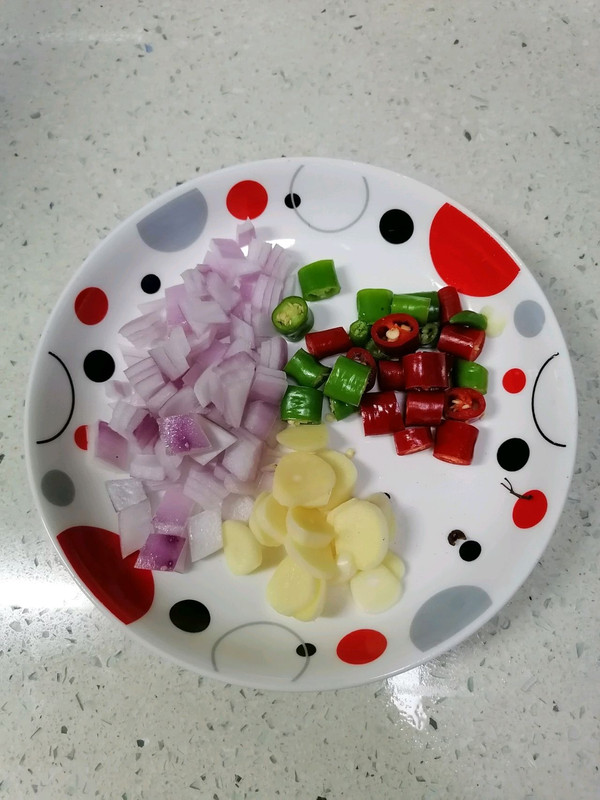 第二步:蒜切片,洋葱切丁,线线辣椒切丁,切好备用!
