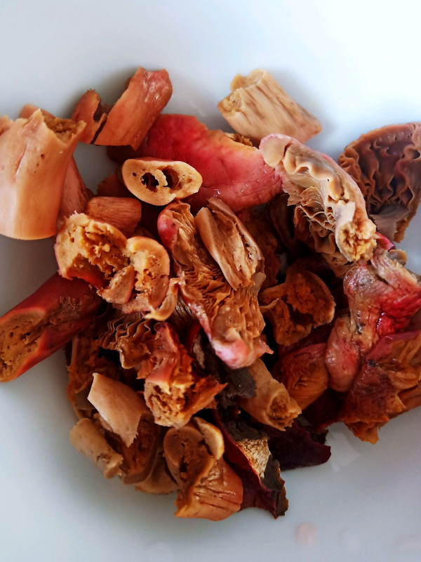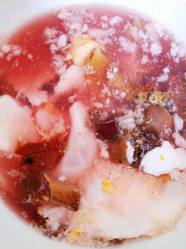 几朵红菇用盐水泡几分钟,然后顺着一个方向搅拌,去除杂质,用流动的水多冲洗几次。