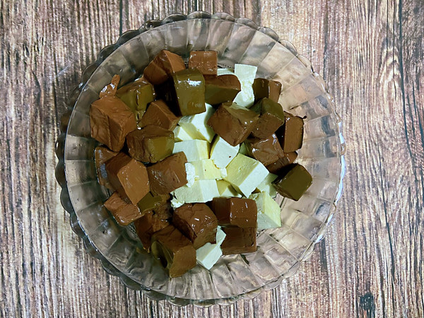 水开倒入鸭血、豆腐,加1勺盐,焯一下。