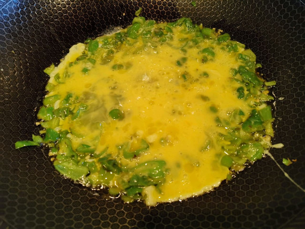 空锅倒入青椒碎,干炒到表面颜色发黄绿色,半熟的样子