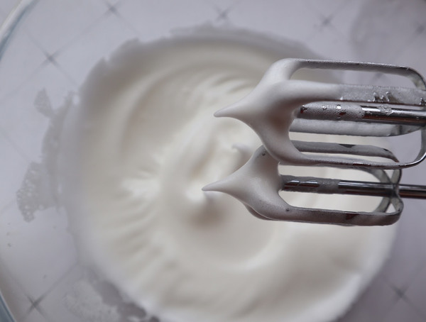 蛋白中加入几滴柠檬汁,分三次加糖打发至小尖角状态~
