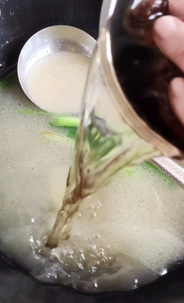 鱼骨放入油锅,炸到酥脆,加入冷水和调料混合烧开,用大火慢慢收汁,煮至汤色乳白浓稠。