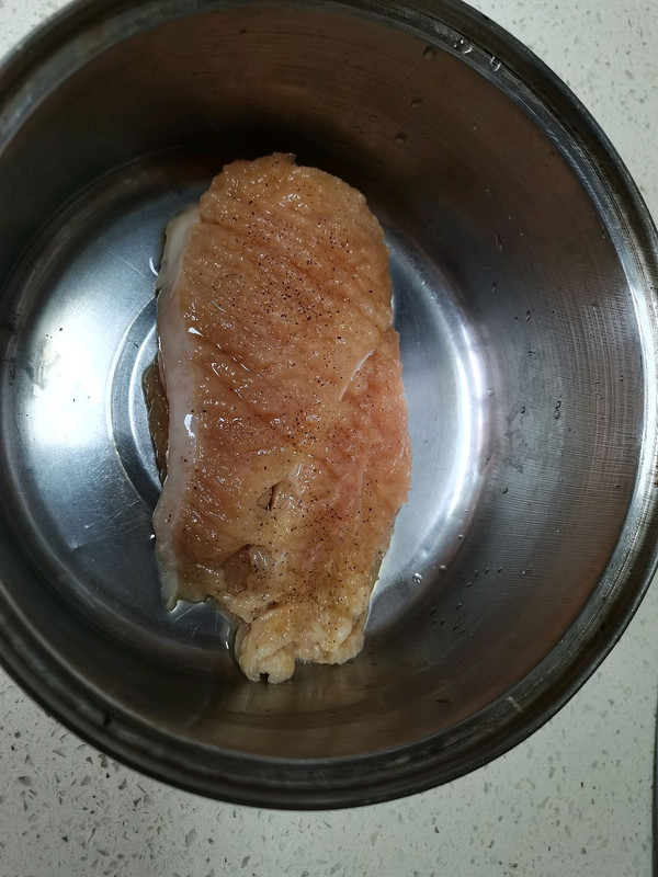 从中间片成两片,用刀背拍至面积增大,鸡胸肉被拍松的表面撒上1克黑胡椒粒,搓上1克盐,再喷洒上少许料酒。
