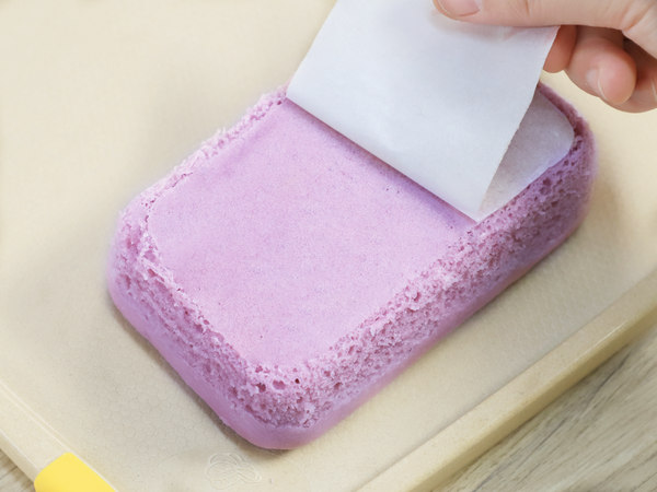 把紫薯发糕倒扣冷却至不烫手后脱模,撕去硅油纸。