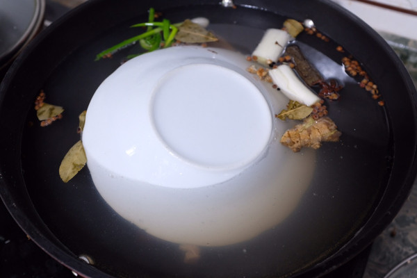 烧一大锅水,加入料酒、葱结、两个八角、一小节桂皮、山奈、花椒、香叶两三片、一小把盐,香料部分可以随意调整目的去腥。放入鸭子,转最小火,保持水不沸腾,需要翻面
