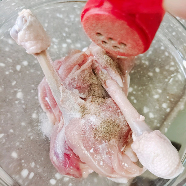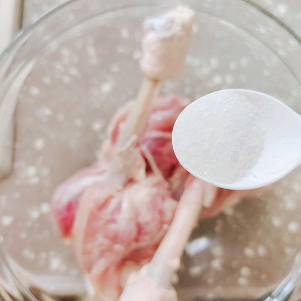 两个鸡腿都这样翻好放入碗中,加一小勺盐