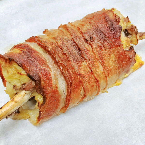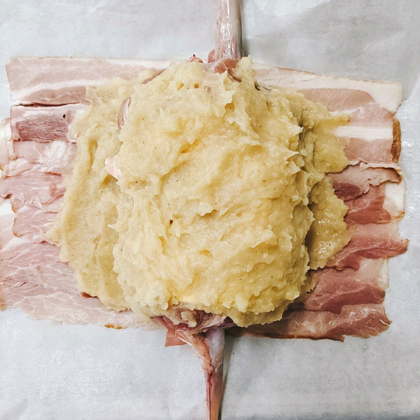 在培根上用勺子均匀地铺上土豆泥,边上留出一点距离不要铺满,再铺上一张芝士片,再从冰箱取出鸡腿铺在上面,两个鸡腿中间塞进剥好的鸡蛋。