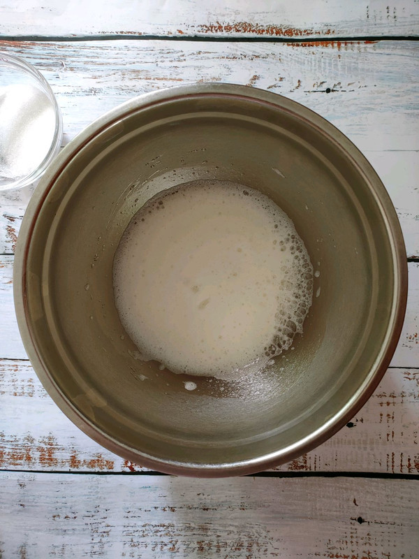 蛋白用电动打蛋器中高速搅打出大气泡时加入第一次细砂糖。