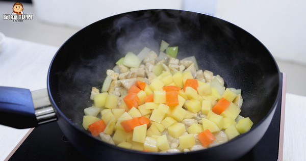 锅内放油,加入洋葱、鸡肉、土豆、胡萝卜翻炒