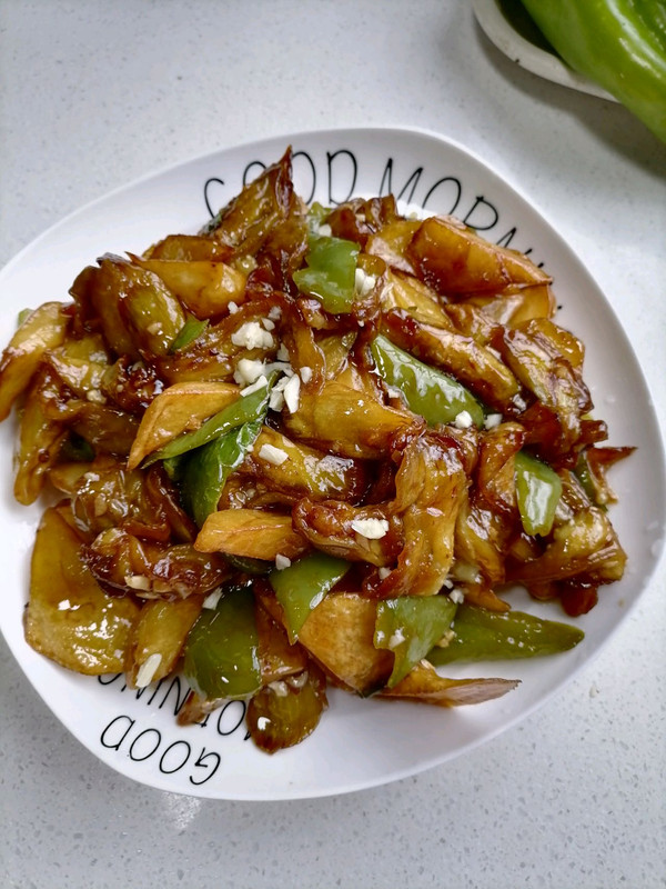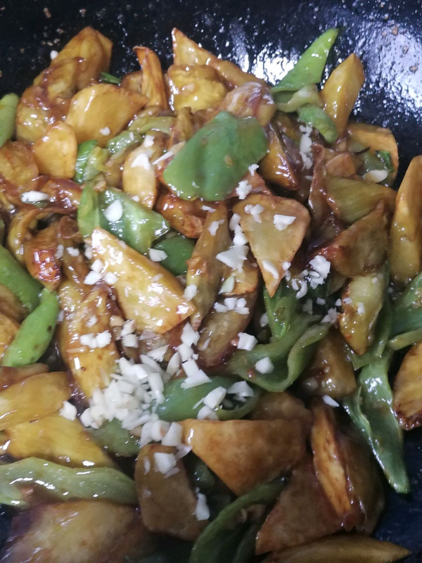 倒入炸好的茄子,辣椒,土豆颠勺翻炒均匀。