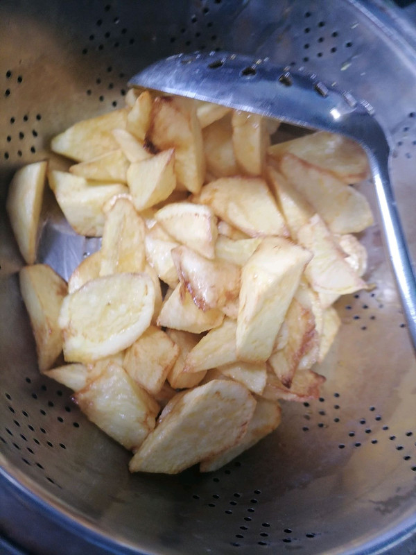 锅里加入多些的油油热后下土豆块儿炸至表面金黄捞出。