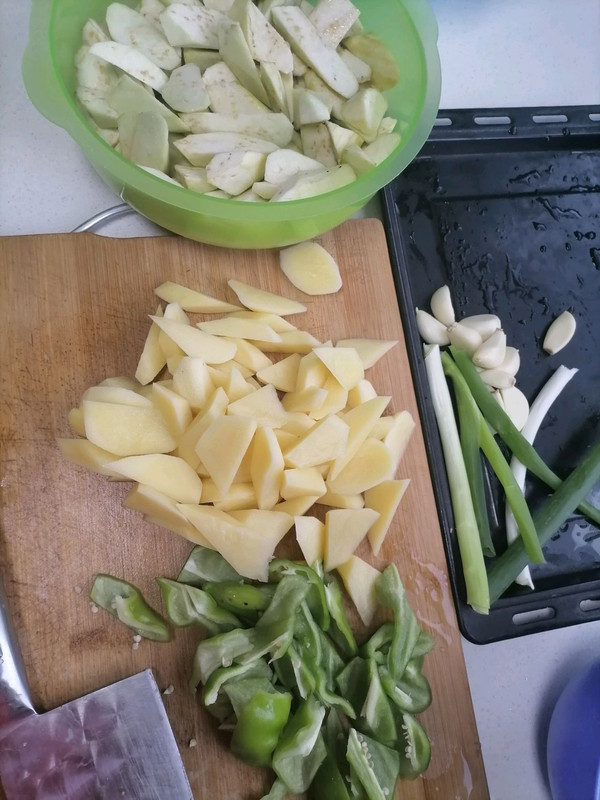 把土豆,茄子,辣椒切成滚刀块儿。