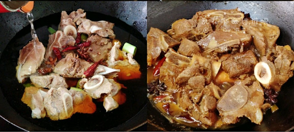 锅中无需放油,将葱、姜、蒜铺在锅底,把焯好水的筒骨码在锅中。