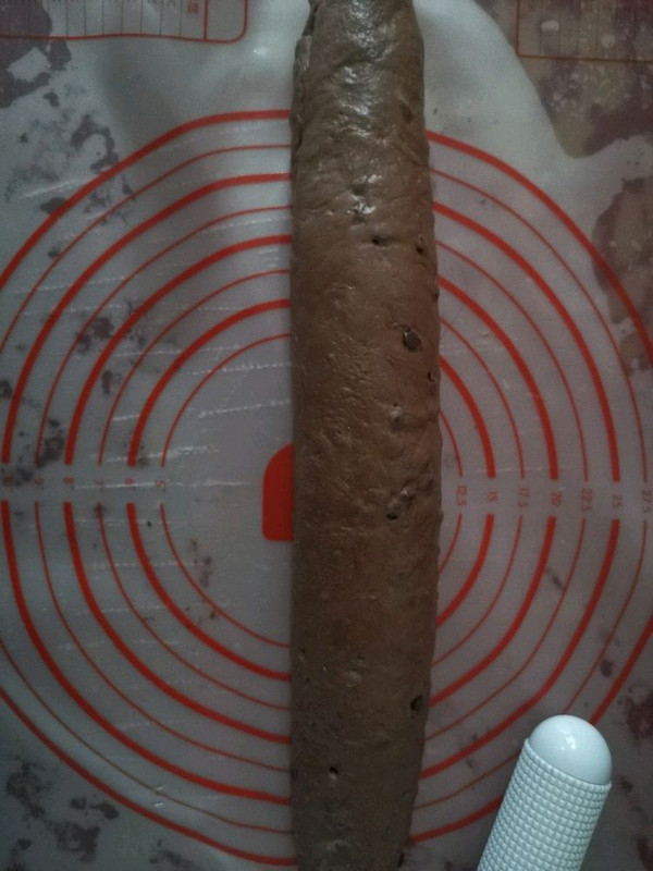 面包体部分,除耐高温巧克力豆和黄油外,其他都倒入面包机。搅打至出厚膜,加入黄油,搅打至出手套膜。倒入耐高温巧克力豆,搅打至充分融入即可(也可以手动混合)