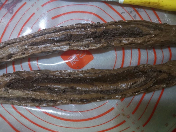 编两股辫,两头折到下面,放入土司盒,发酵至八分满。