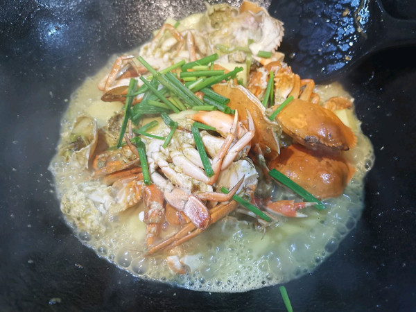 青蟹洗干净,取出不能食用部分,提前将蟹钳敲碎,以便入味。