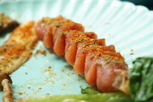 然后把食物烤至两面金黄,两面沾取适量的辣椒孜然粉就可以吃了。