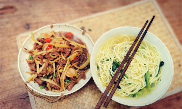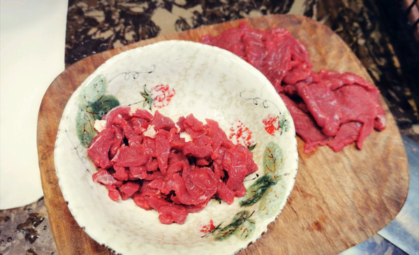 切好的牛肉丝加老抽、耗油上色。加入葱姜水(比料酒和黄酒去腥效果好),200g牛肉20g水就行,熟悉了可以看感觉。揉匀(同一方向)。