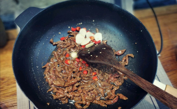 刚刚炒白萝卜丝的油倒掉,加新的油,油温热后,转小火,炒肉丝