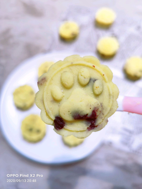 熬好的绿豆分成15份,每份揉成小圆球,塞到模具里压出形状