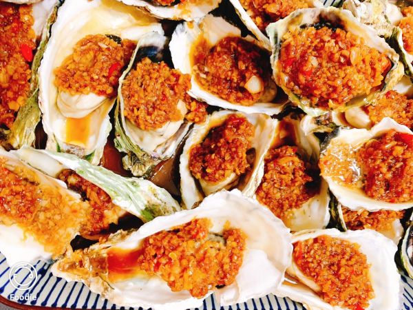 把放凉的蒜蓉酱舀放到每一个生蚝上