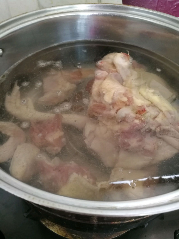 鸡肉切小块倒入锅内,加好多水,开火~