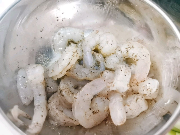 虾仁去虾线,加点黑胡椒粉和橄榄油一起腌制30分钟以上,备用