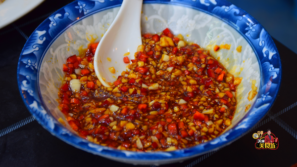 红椒切碎,大蒜拍扁剁碎,一起放到盘子里面,再用热油爆香,然后加入1茶匙食盐,加入1汤匙生抽,加入1汤匙蚝油,搅拌均匀,做成蒜香汁。