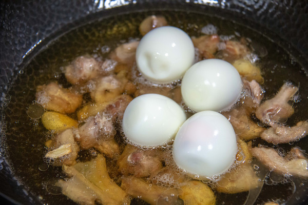 放入去壳后的鸡蛋和一罐啤酒,一勺盐和2勺生抽,大火煮开后改中小火焖20分钟左右。