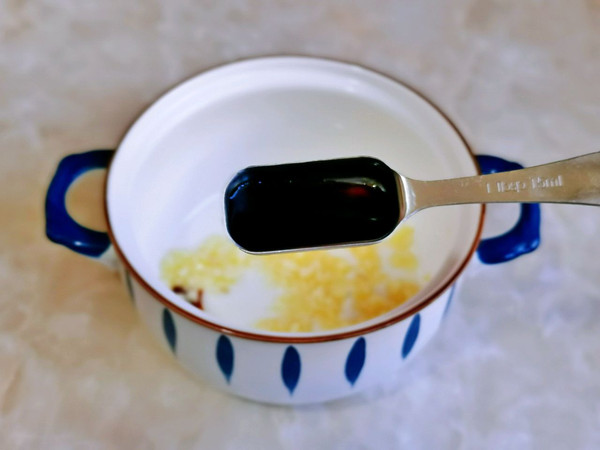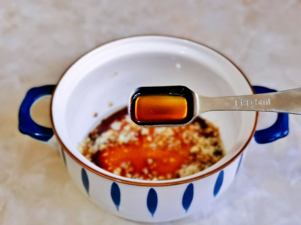 切好的大蒜放入泡面碗中,淋上一勺热油,炸出蒜香。