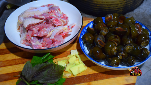 在开始正式制作之前呢,我们首先需要准备以下食材:老母鸡半只,田螺500克,紫苏叶6片,生姜1块,食盐2茶匙,胡椒粉1汤匙,料酒适量