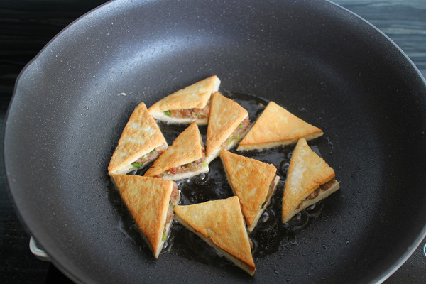 豆腐片撒少许淀粉,再夹入少许肉馅整理好边沿;