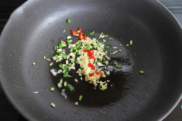 葱、姜、蒜末放入锅中炒香,放入少许辣椒;