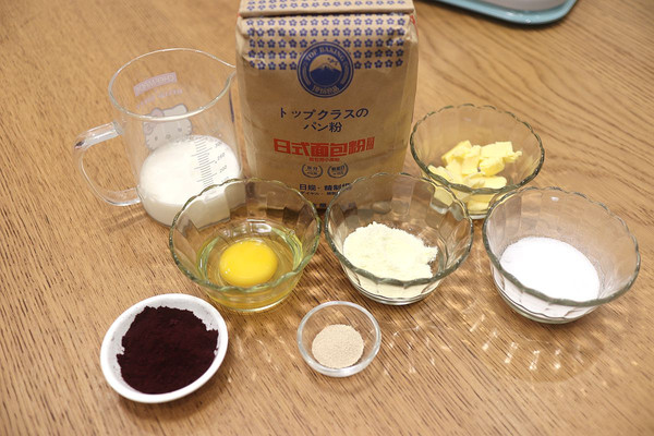 面包材料准备好:高筋面粉220克,耐高糖干酵母2克,奶粉10克,鸡蛋50克,白糖25克,牛奶90克,黄油20克,黑醋栗粉6克;黑醋栗粉可用等量的抹茶粉、可可粉、草莓粉等代替;