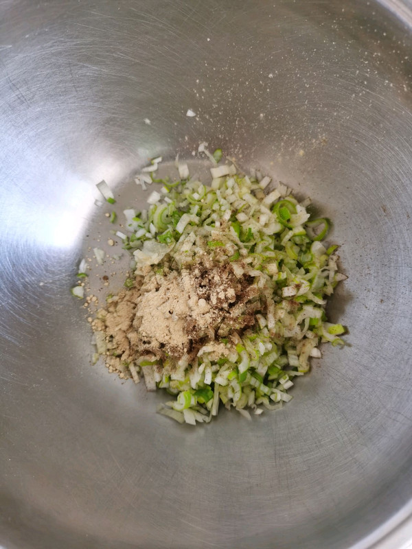 葱切成末,加入胡椒粉,十三香,姜粉,锅中倒入油烧热浇在葱花末上炸出香味搅匀,放凉后加入鲅鱼肉。