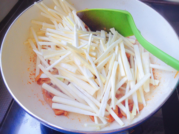 平底锅中火烧至掌心灼热,调入花生油15ml,转大火烧至油温六成热时候,放入葱花和姜丝,小火爆香下里脊丝迅速滑散。