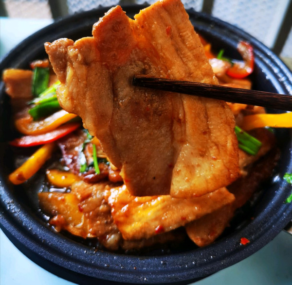 平底锅放油,加入蒜末炒出香味下腌制好的花肉薄片,小火煎至两面金黄。