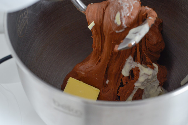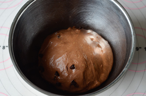 配方(4个,放学厨kitty烤盘正好) 高筋面粉 115g;可可粉8克;糖17g;高糖酵母2克; 盐 1g;牛奶 70克;鸡蛋 12克; 黄油9克;淡奶油12;水滴巧克力豆 20g 1. 黄油以外的材料扔进厨师机。