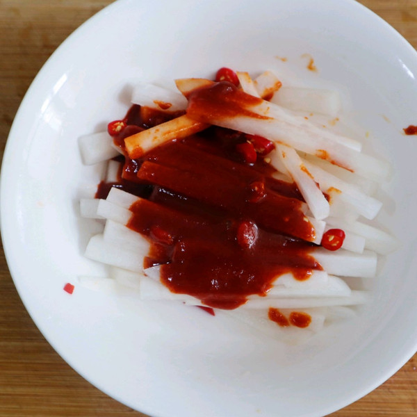白萝卜倒出腌制多余的水份,根据口味放点小米辣,辣椒酱汁混合均匀