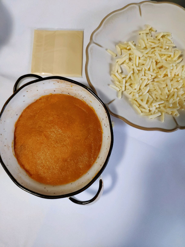 马苏里拉芝士提前解冻备用,地瓜泥和黄油拌匀后拿刮刀抹平。